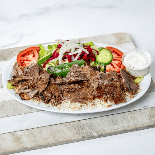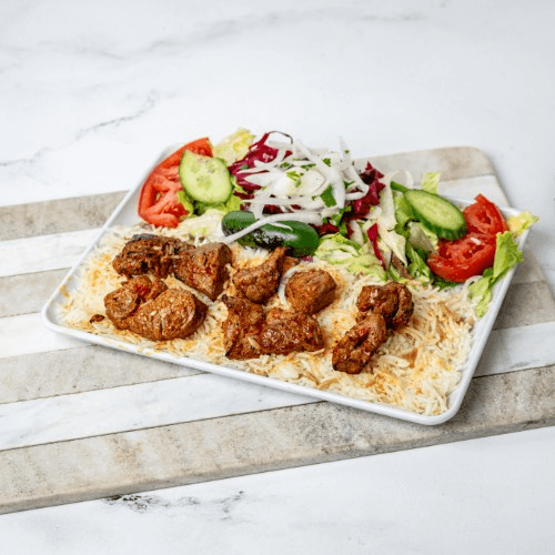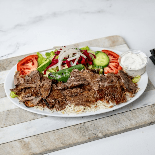 Tender beef & lamb, grilled vertically and thinly sliced served with rice and salad