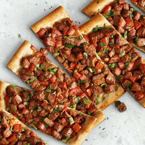 Turkish flat breads topped with ground meat, cheese, green peppers and tomatoes.