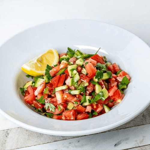Chopped tomatoes, cucumbers, peppers, parsley, and onions, tossed in lemony olive oil and pomegranate molasses