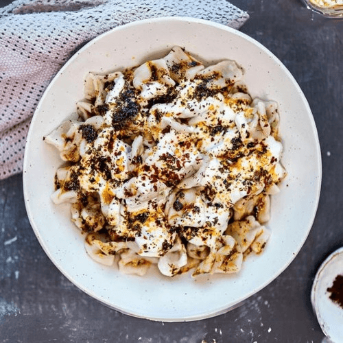 Minced beef, garlic yogurt, burnt butter, dried and red pepper