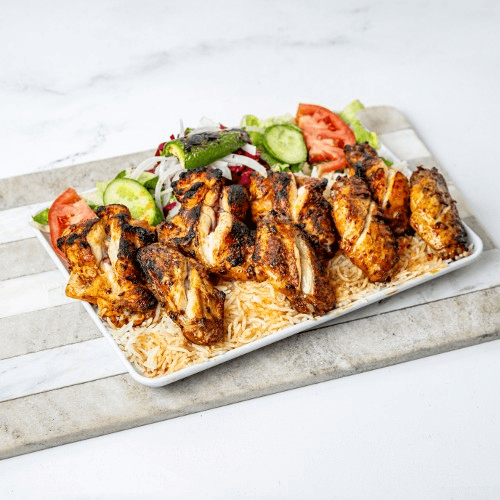 Marinated chicken wings grilled on a skewer. Served with salad, rice and side ranch dressing