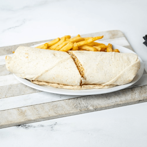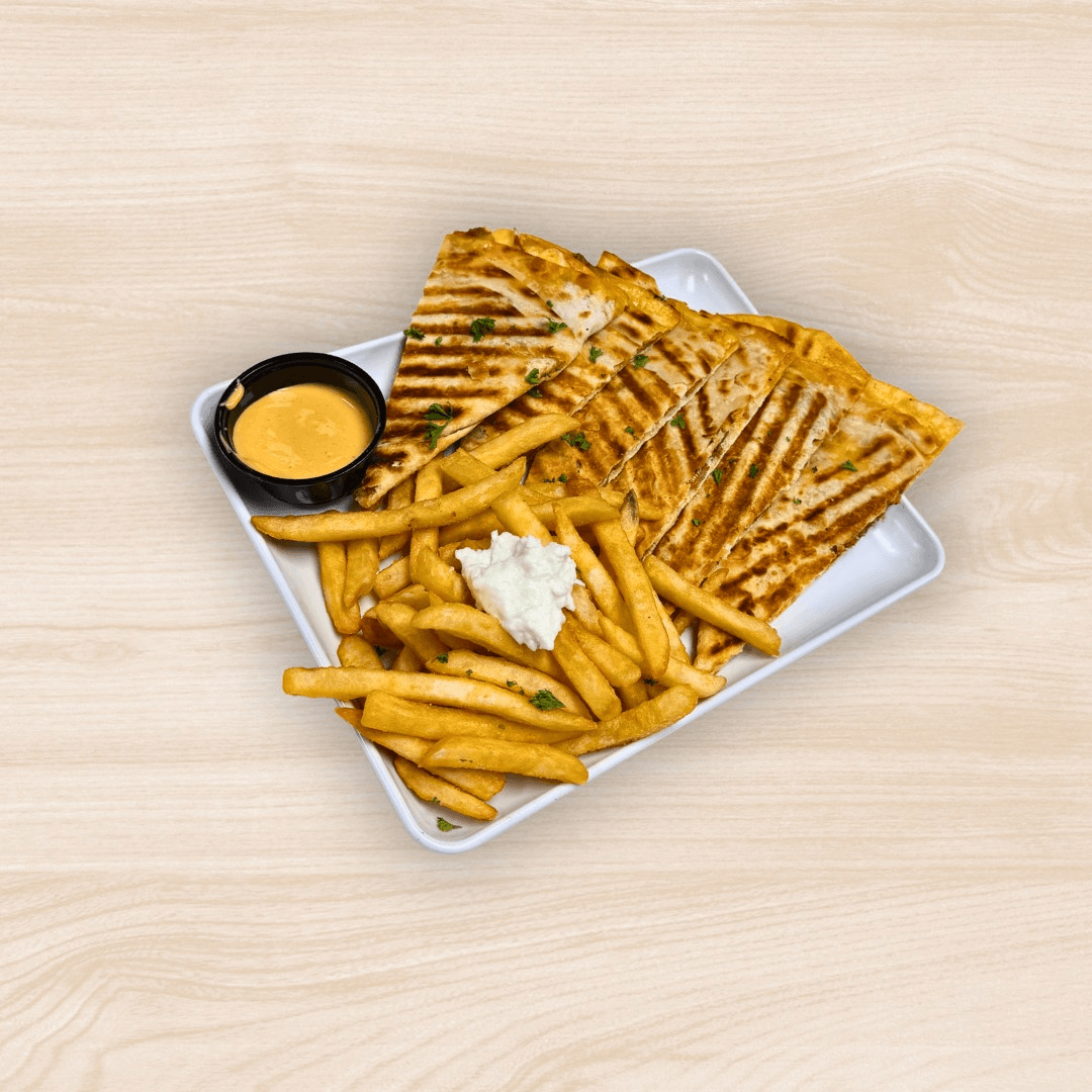 Warm and crispy flat bread filled with melted cheese and your choice of extra cheese, Chicken, Beef. Served with a side of fries.
