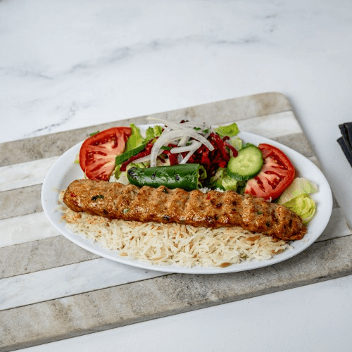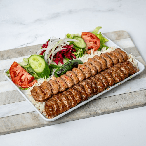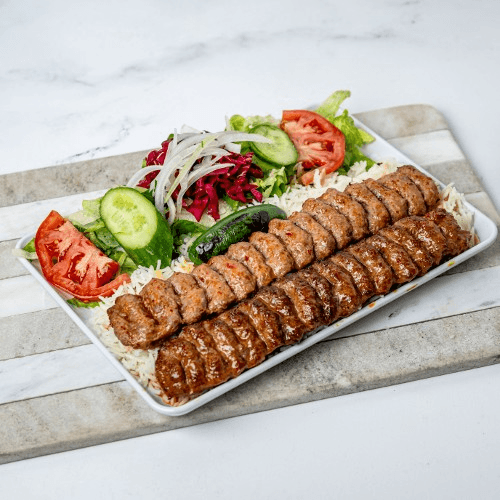 A combination of chicken shish and lamb adana kebab. Served with rice and salad