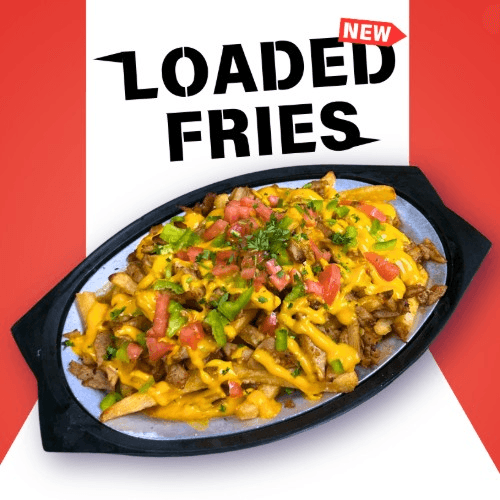 Crispy French fries topped with chicken shawarma, cheddar cheese sauce, diced tomatoes, and jalapeños.
