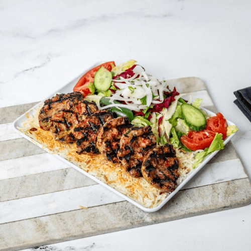 Ground lamb shaped into patties specially seasoned and grilled. Served with rice and salad