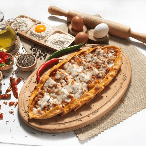 Savory Pide comes from the Bafra region in Turkey. It has a boat-shaped crust filled with ground meat and cheese