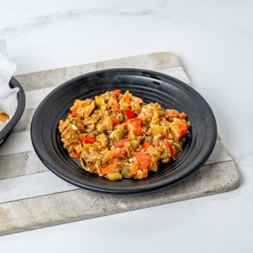 Cubes of fried eggplant mixed with fresh tomato peppers, onions and garlic