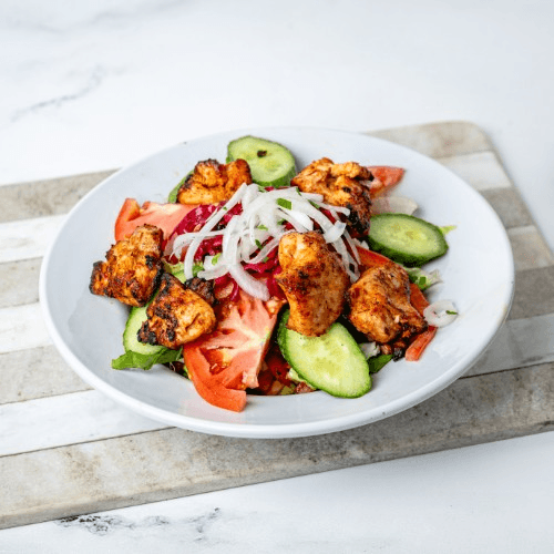 Mixed greens, tomatoes, cucumbers, red cabbage, onions, tossed with house dressing and topped with chicken shish