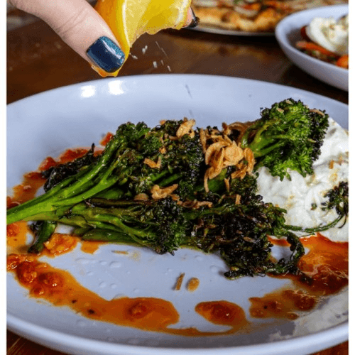 Charred Broccolini season ricotta, calabrian chile, crispy shallot and citrus.