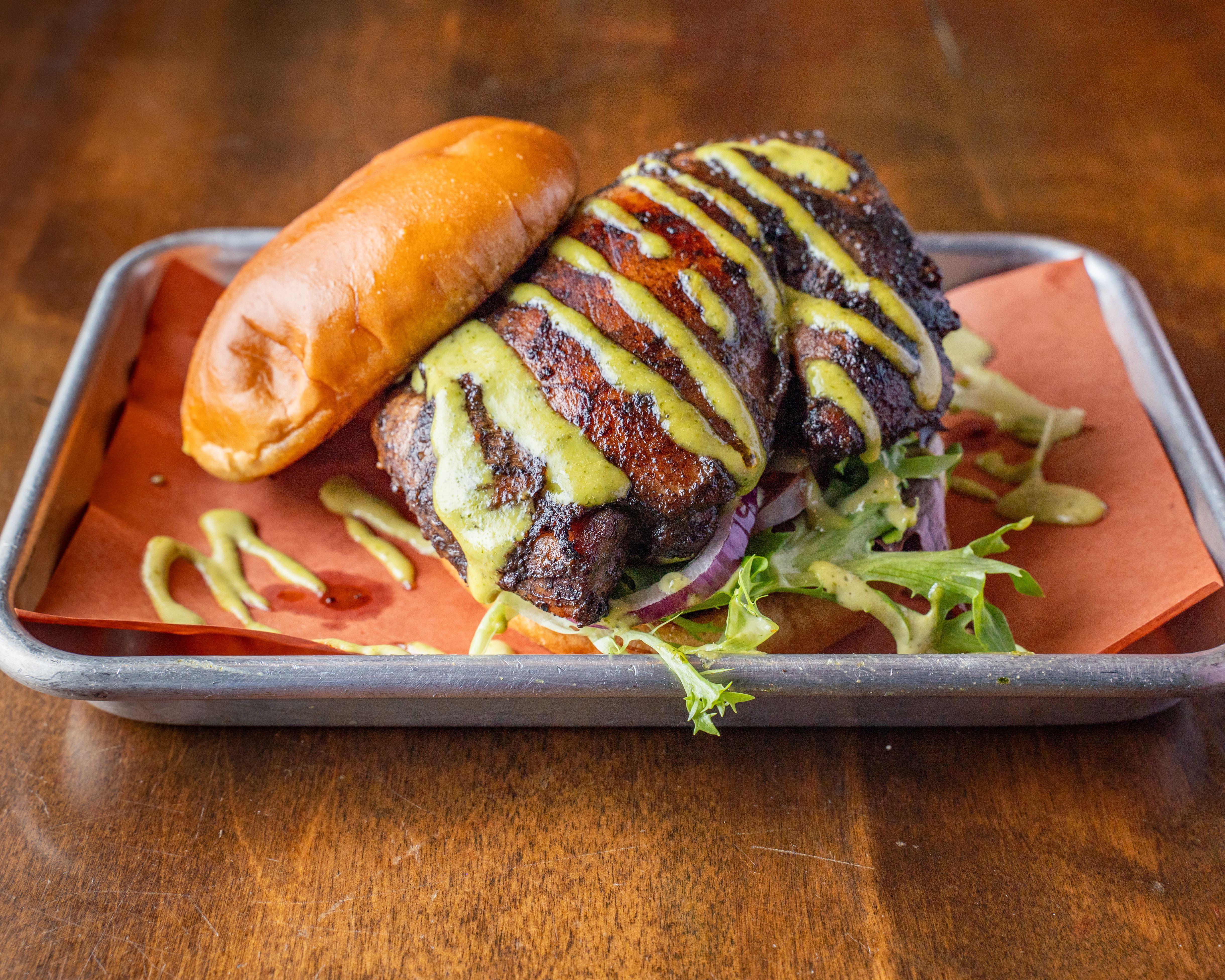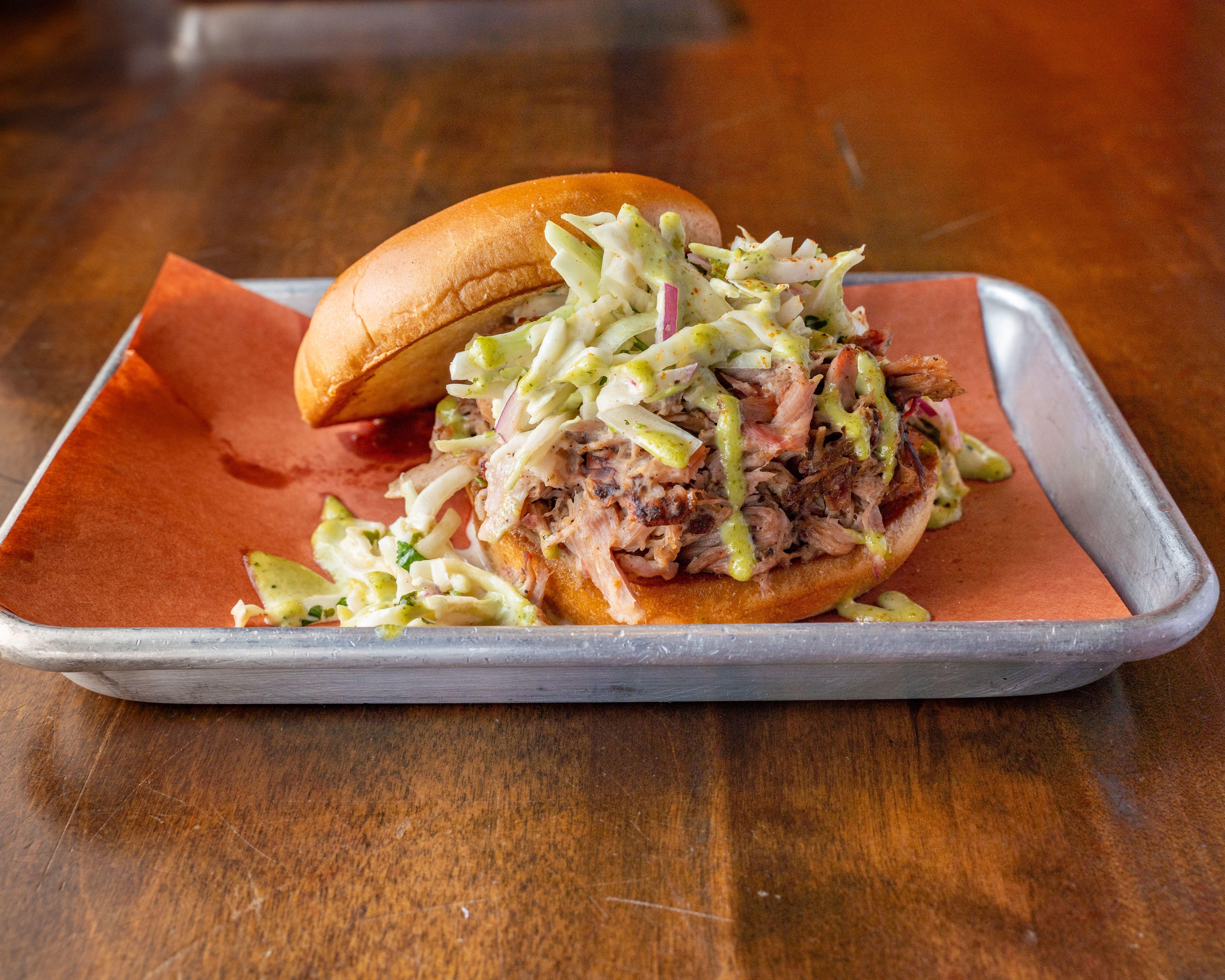 Stuffed sandwich with your choice of 1 meat. Our cilantro lime slaw, garlic aioli, on a brioche bun