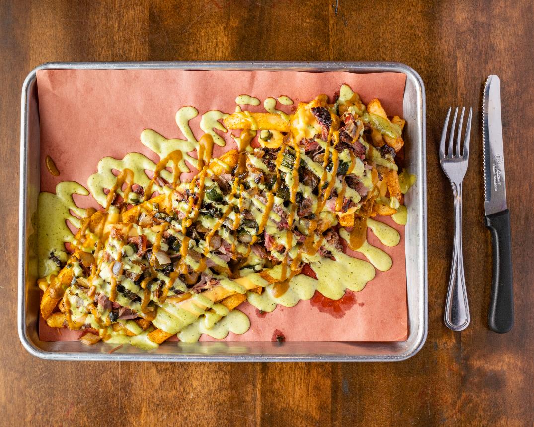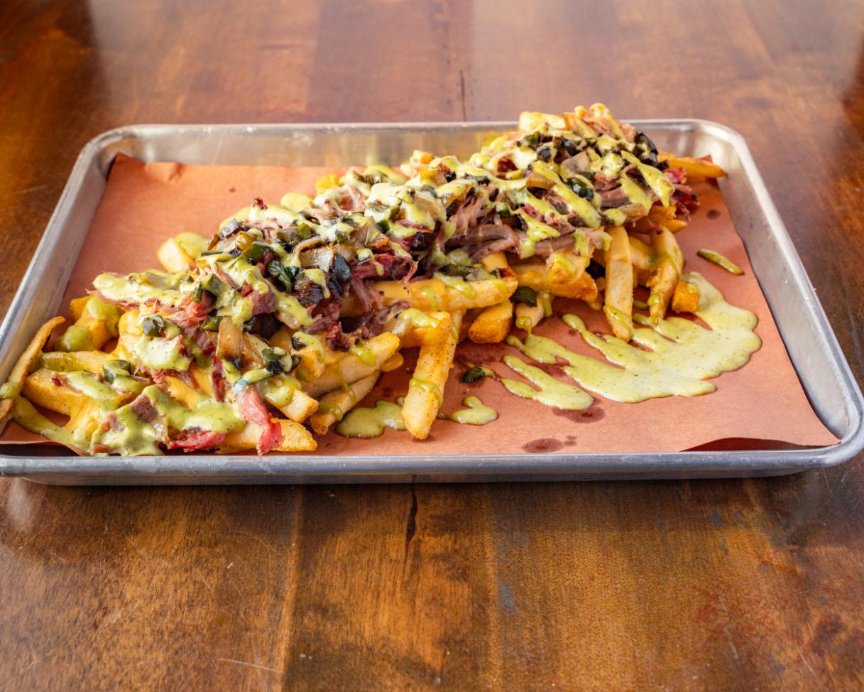 Tasty fries tossed in our house made bangin curry rub, smothered with Cheddar cheese sauce, sautéed peps and onions, topped with garlic aioli and coconut curry honey mustard