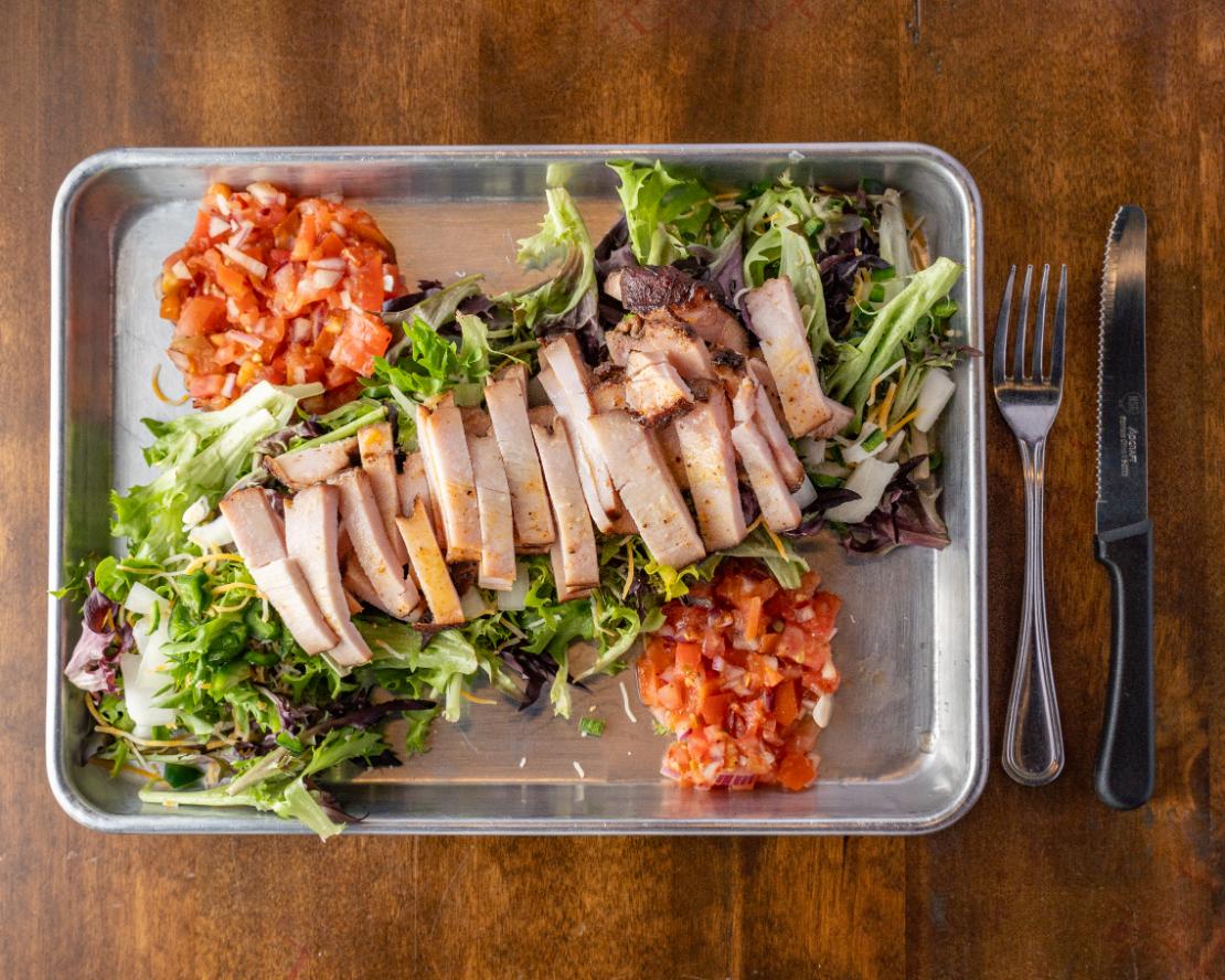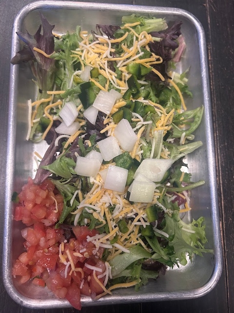 Spring mix, shredded cheese, diced poblano Vidalia onions, pico de gallo. Choice of one of our scratch made dressings.
