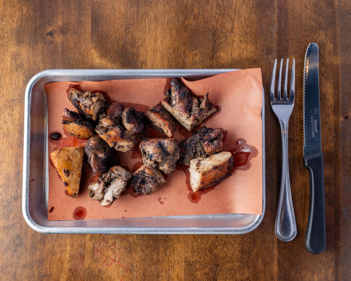 Traditional jerk chicken rub. Like legit jerk chicken. House made wet jerk rub, smoked with pecan wood, seared and slapped with real butter. It's spicy, it's legit, it's delicious!