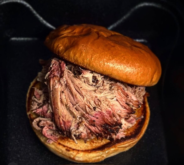 Slow smoked using pecan wood. Sandwich served with one side on garlic toasted brioche bun