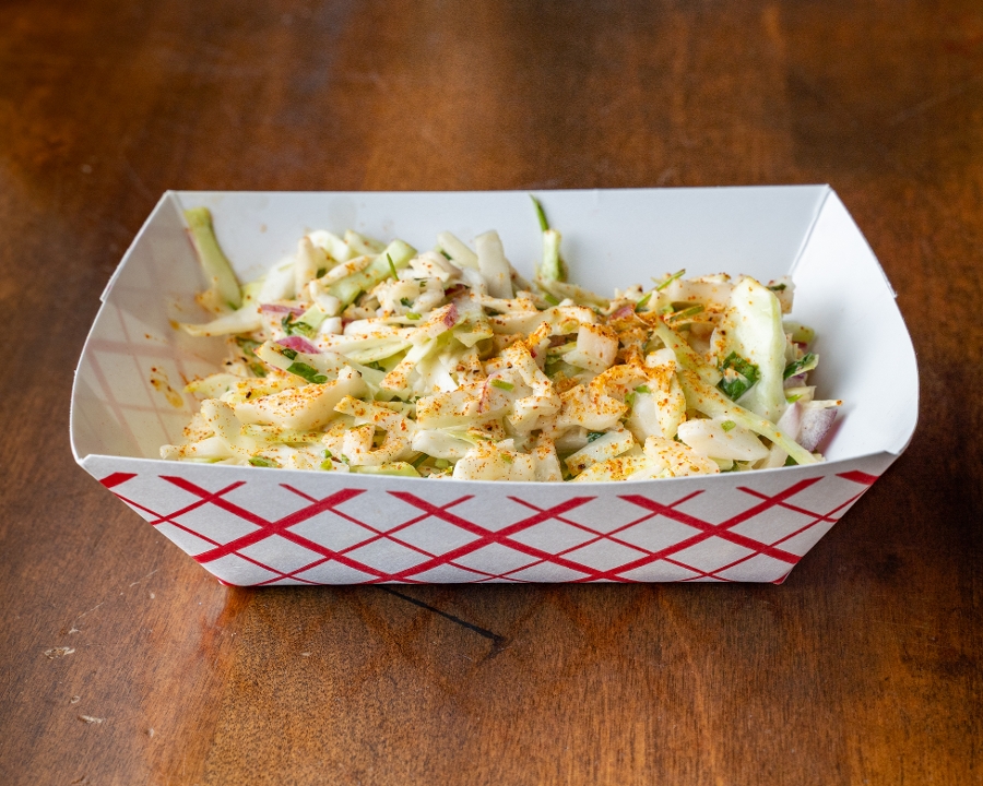 Hand cut cabbage, red onion, cilantro, and a house made slaw dressing. Mayo/vin base
