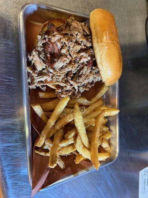 3 ounce of pulled pork, brioche bun toasted with real butter and garlic served with fries and a drink.