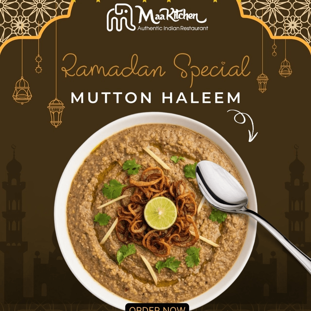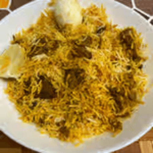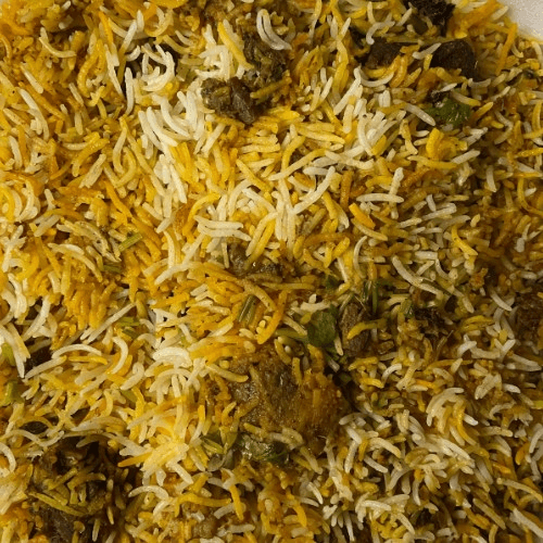 Fresh tender Bone-in Goat cooked in whole and ground spices topped with premium Basmati Rice, ghee, spices, mint and fried onions. Spicy.