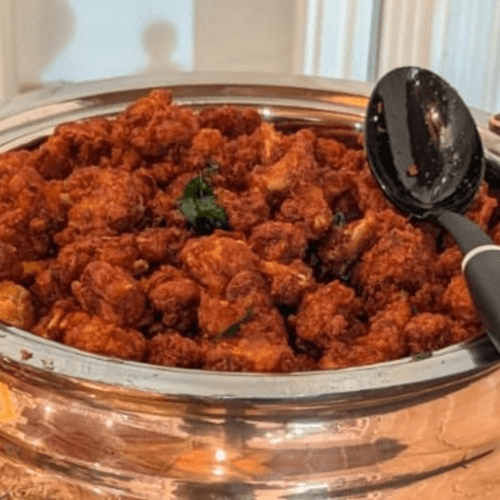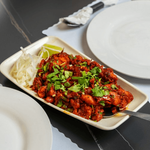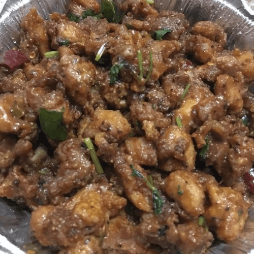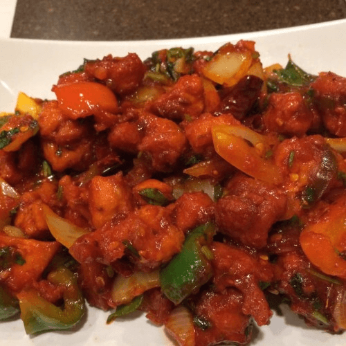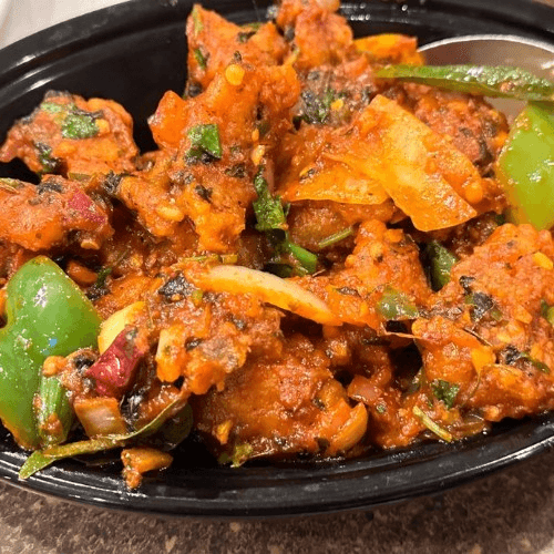 Vegan. Deep fried cauliflower florets sautéed with onion & capsicum with chili sauce