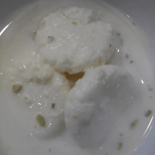 An Indian sweet dish consisting of small, flat cakes of paneer (curd cheese) in sweetened, thickened milk