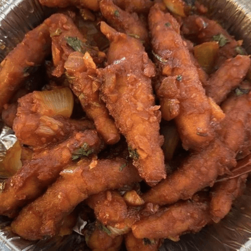 Boneless fish fillets marinated in spices and Manchurian sauce, then deep-fried.