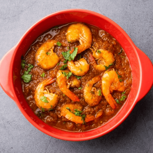Shrimp (Prawn) cooked in a mild creamy tomato gravy with onions and bell pepper.