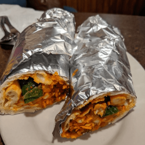 Minced paneer tikka pieces in Indian special sauce wrapped with naan or chapati or roti