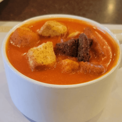 Tomatoes blended with cream, pepper and served with fried bread