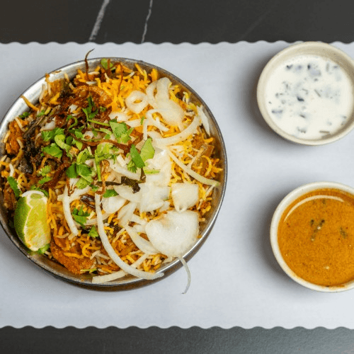 A special South Indian-inspired glorious layering of irresistible chicken, basmati rice, fresh herbs, crispy onions, and a tiny drizzle of ghee.