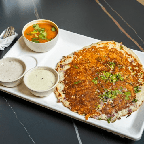 A thick pancake or dosa, It is topped with finely chopped vegetables like tomatoes, carrots, capsicum, and coriander, which add color, flavor, and nutrition.