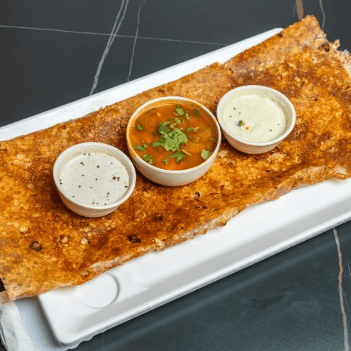 A whisper-thin, crispy Indian crepe- light as air, yet packed with flavor when dipped in our signature chutneys and spicy lentil soup (sambar)