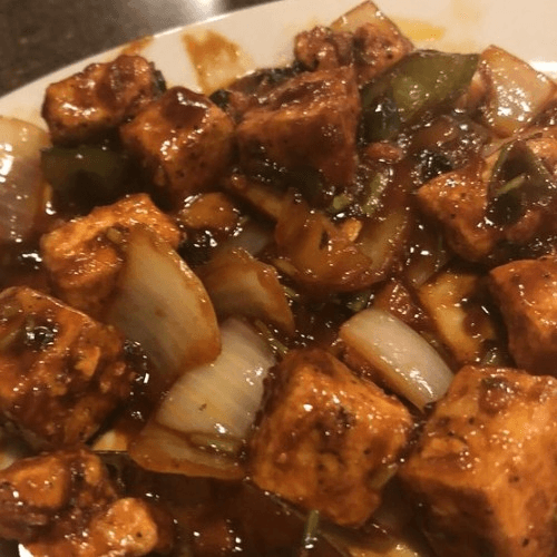 Cubes of fried crispy paneer are tossed in a spicy Manchurian sauce tossed with green chilies, onions and touch of garlic.