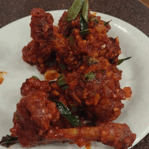Crispy fried bone-in chicken, marinated and tossed with onions, curry leaves, and spices.