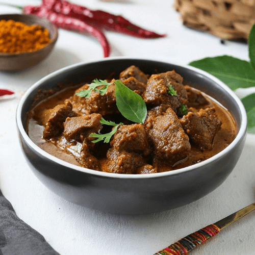Goat cooked with potatoes in fiery, tangy, red hot curry sauce. A Goan specialty.