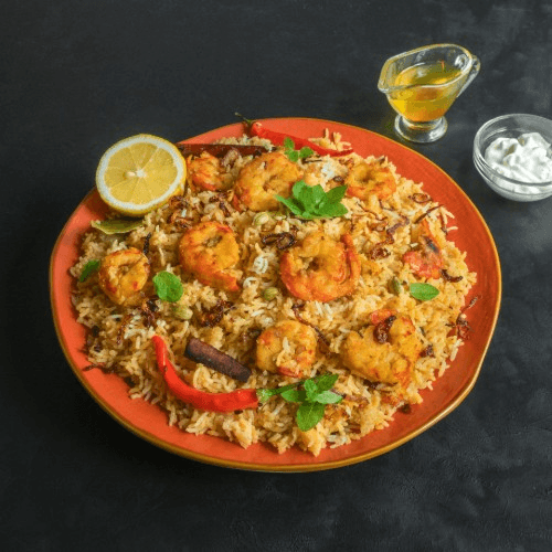 A fragrant, layered rice dish featuring succulent shrimp marinated in a blend of spices like cumin, turmeric, garam masala, and often yogurt, cooked with aromatic basmati rice, and finished with fresh herbs.