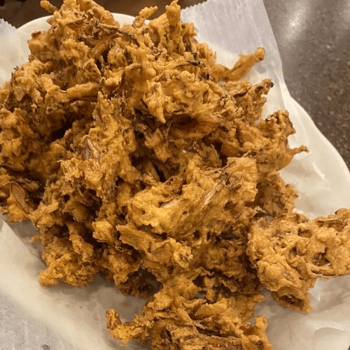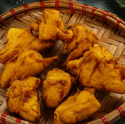 Mixture of urad dal batter, rice flour, onions and chilies deep fried. Vegan