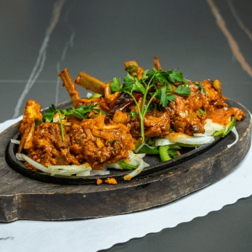 Bone-in Goat meat cooked with yogurt, fried onions and aromatic spices. Spicy.