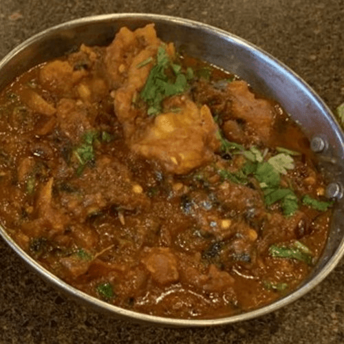 A spicy and slightly sour tasting curry made with chicken, gongura (sorrel leaves), onions, chilies, spices & herbs. Spicy.