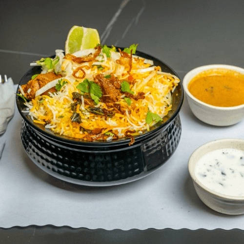 Dum Biryani, a fragrant rice dish layered with succulent pieces of Bone-in Goat marinated in aromatic spices, slow-cooked to perfection in a sealed pot.