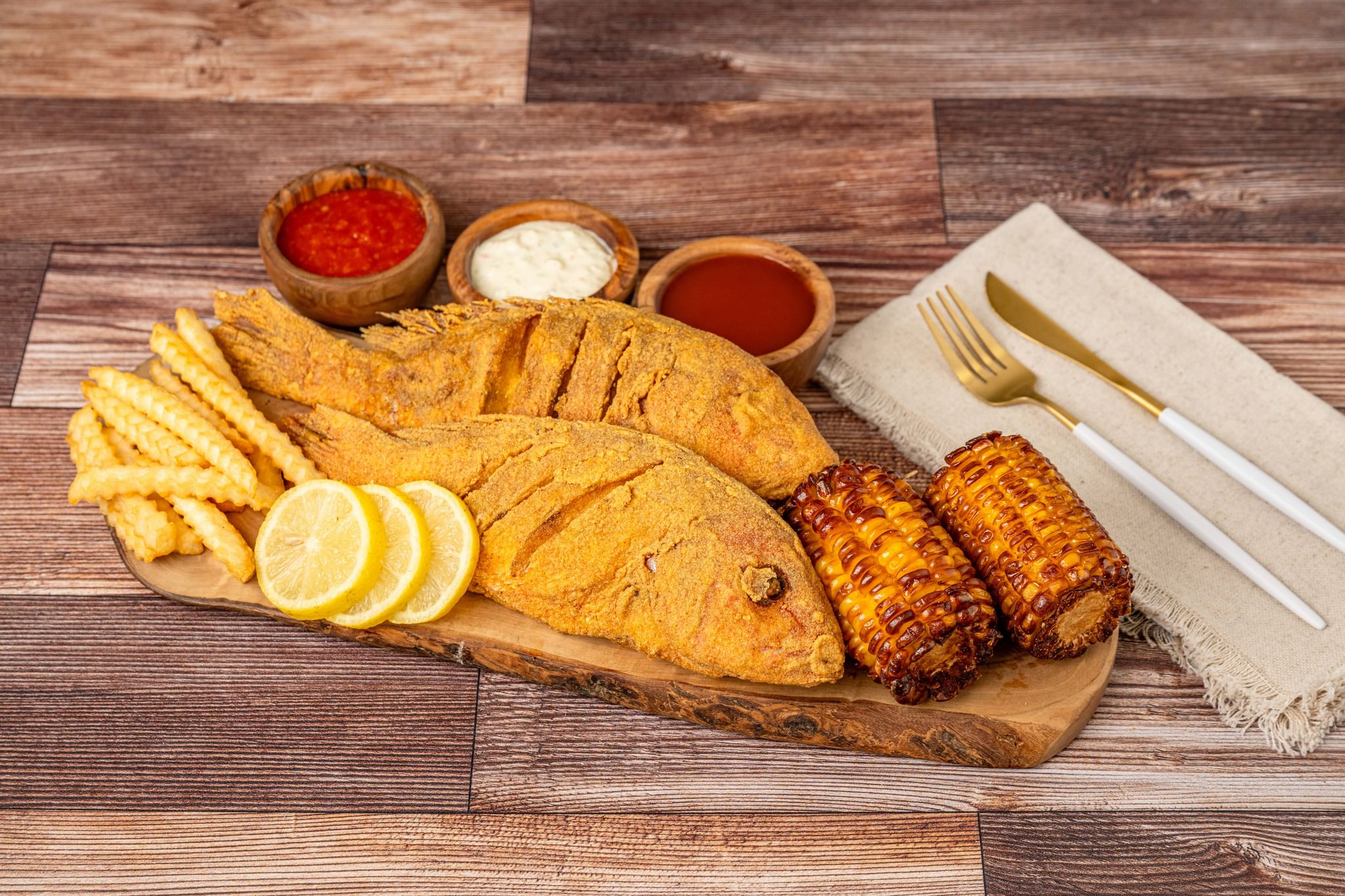 Catfish fillet, shrimp, crinkle-cut fries, and a lemon wedge. Served with tartar sauce and cocktail sauce