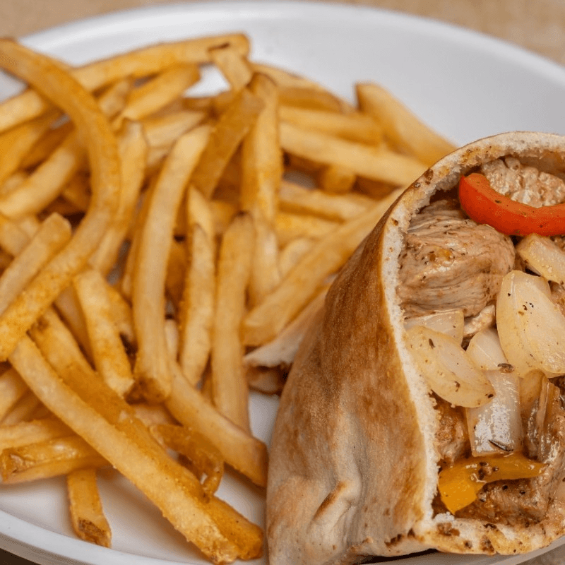 Grilled chicken, peppers, and onions, in a pita with white American cheese.