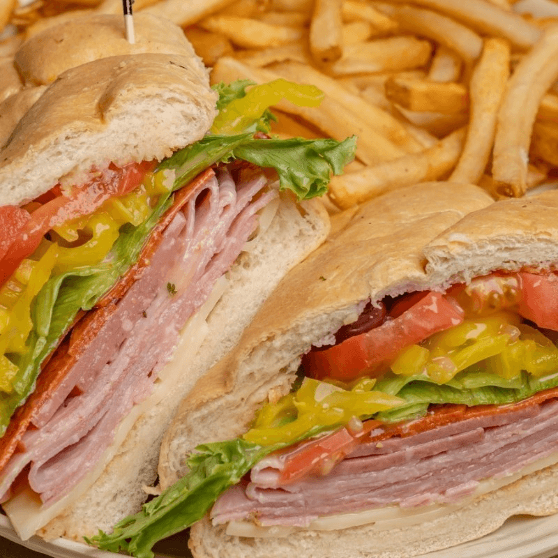 Ham, bologna, salami topped with lettuce, tomato, banana pepper, and Italian dressing in a pita with yellow American cheese.