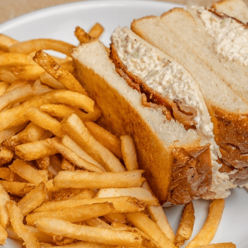 Our homemade chicken salad with bacon, and provolone on pressed sourdough bread.