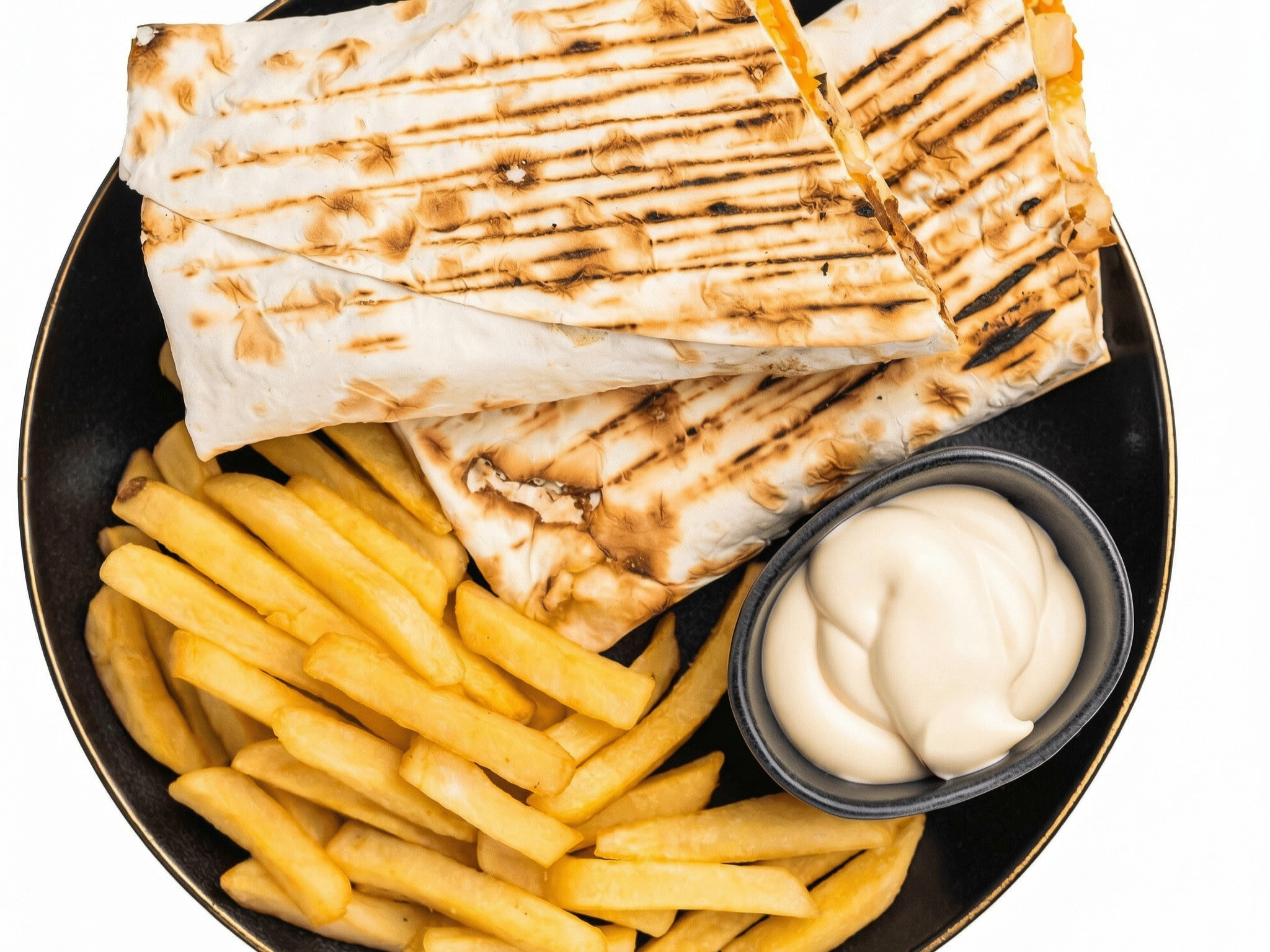 A classic gyro wrap featuring seasoned meat, fresh vegetables, and cool tzatziki sauce.